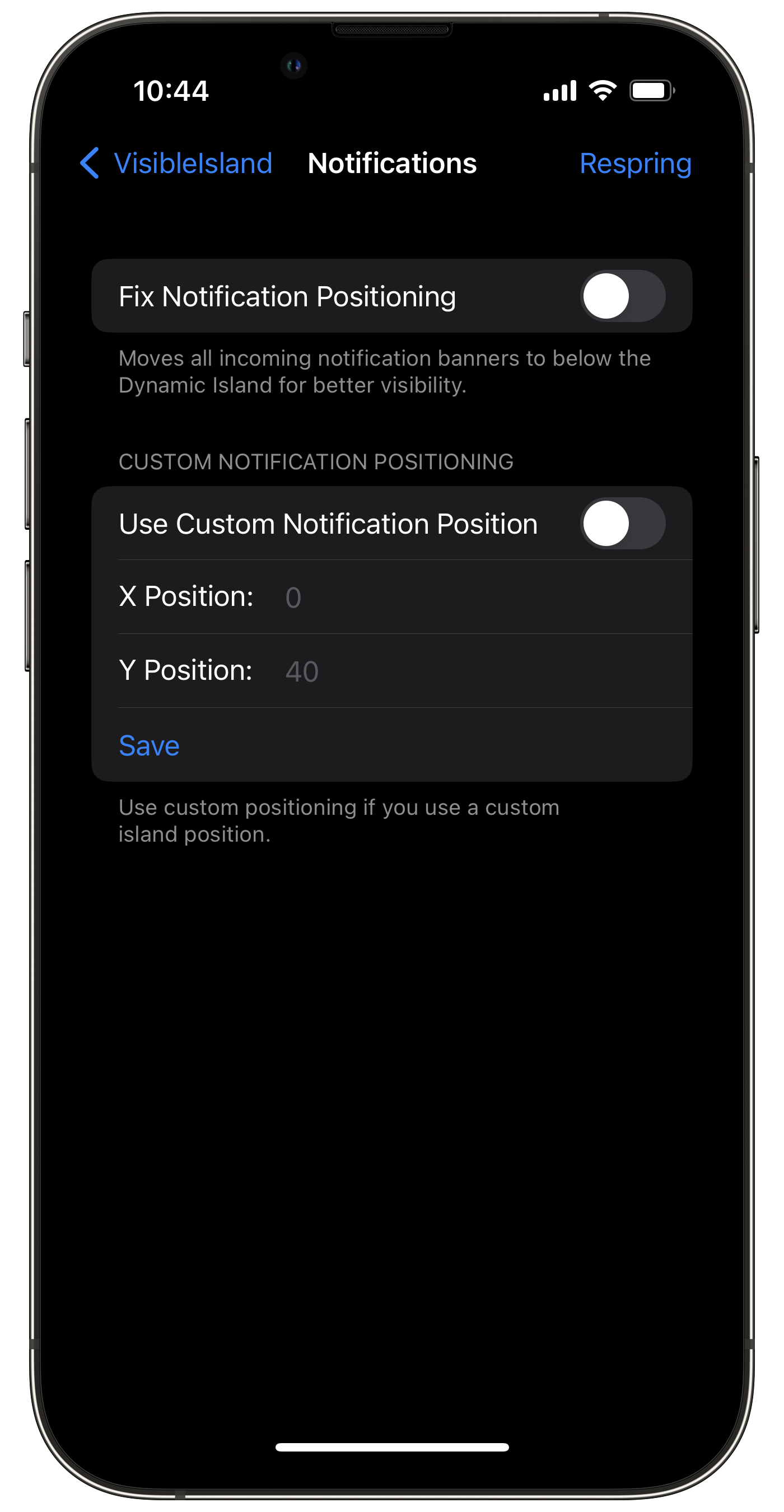 - Set the position of the Dynamic Island to anywhere you want using custom X and Y offsets